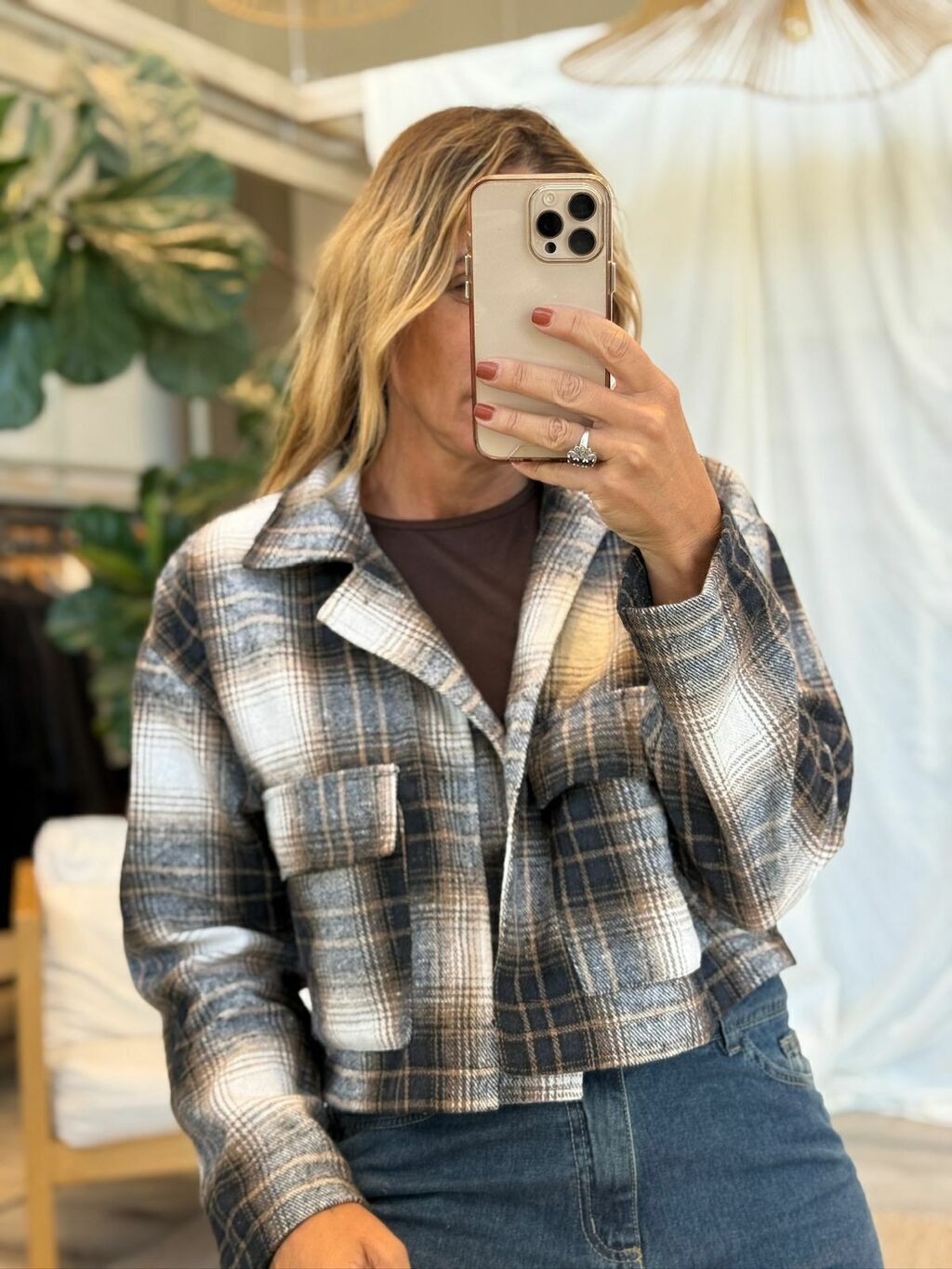 La modelo en la imagen muestra cómo el CAMISACO CUADRILLE se ajusta cómodamente, ofreciendo un balance perfecto entre confort y estilo. No te quedes sin este esencial para tu armario y disfrutá de una prenda que nunca pasa de moda.