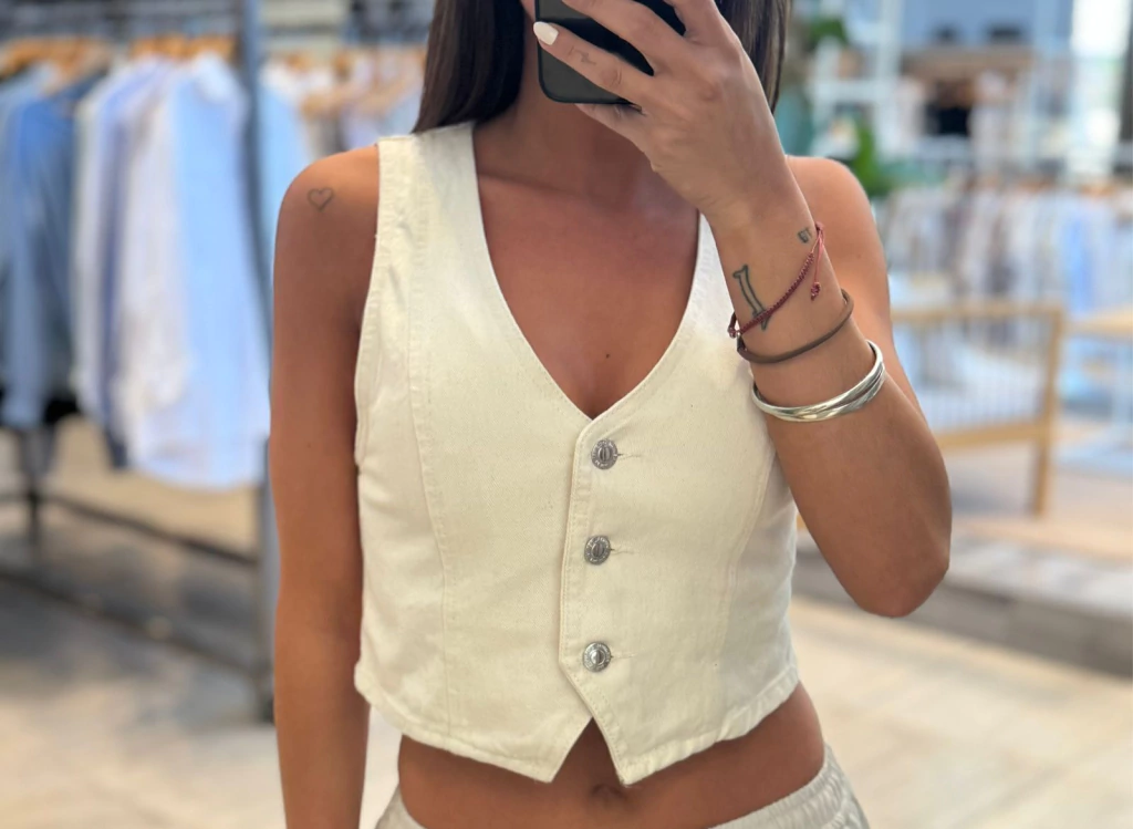 Su confección detallada realza tu figura mientras te brinda libertad de movimiento. Perfecto para combinar con prendas casuales o formales, el CHALECO SASTRE LATTE es la elección ideal para destacarte con un look único.