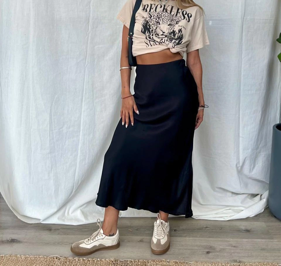 El tejido de satén de alta calidad brinda un drapeado perfecto, mientras que su diseño atemporal se adapta a diversas siluetas. La modelo en la imagen lleva el talle 40, destacando la belleza de esta falda.