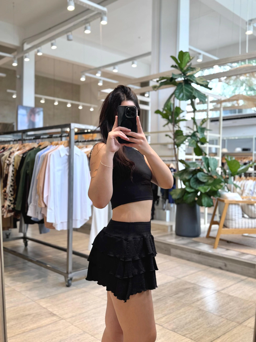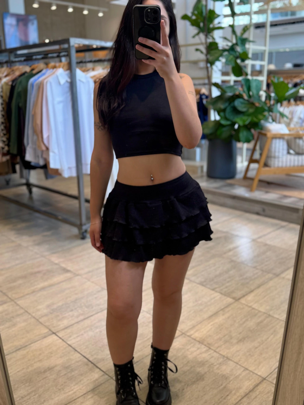 Su diseño con tres volados aporta movimiento y un toque romántico, ideal para combinar con tops básicos o blusas elegantes. Perfecta para días de verano o salidas casuales, esta mini se convierte en tu aliada para destacar con cada paso.