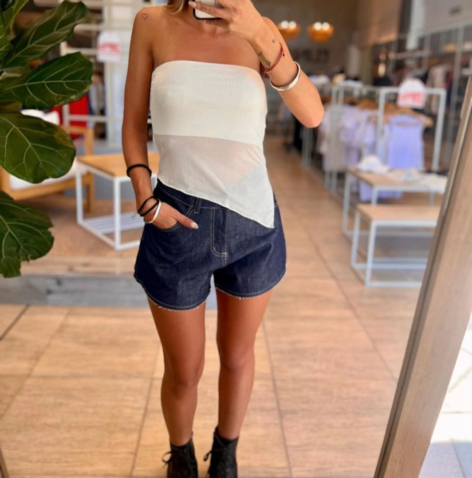 Este top se puede combinar fácilmente con pantalones, faldas o shorts, convirtiéndose en una pieza esencial para tu guardarropa. La modelo en la imagen demuestra cómo el TOP DE MICROTUL realza la figura, brindando un estilo encantador y sofisticado. 💖